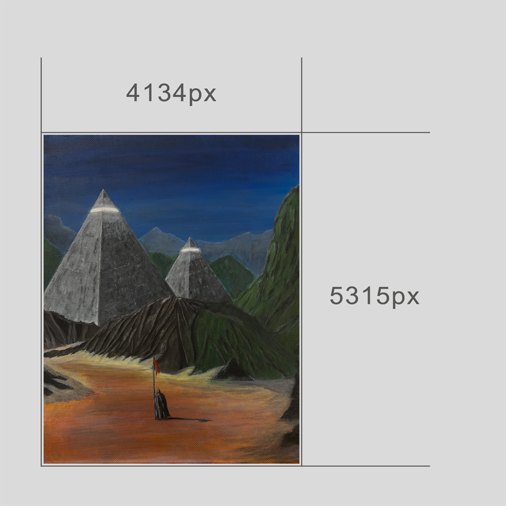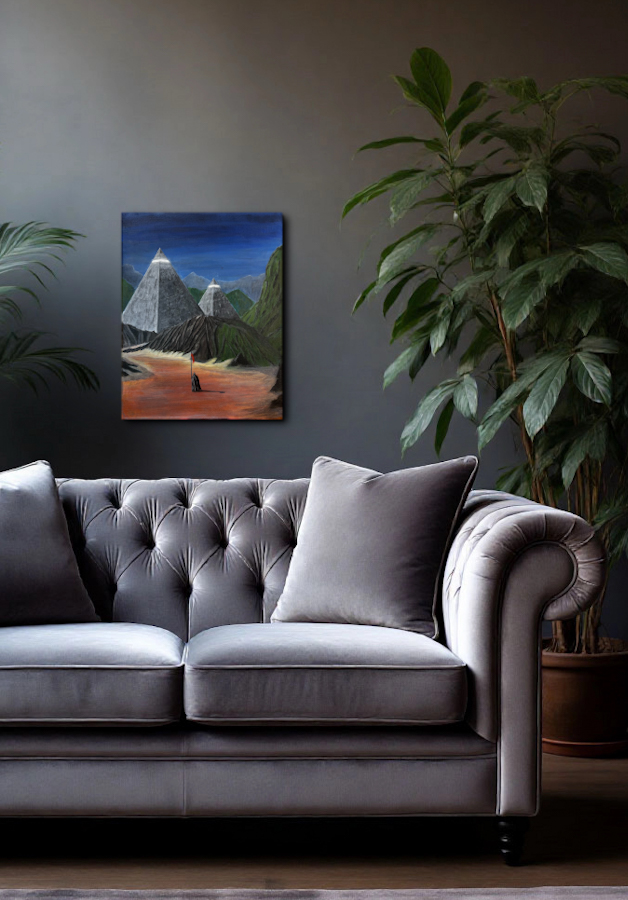 In the heart of a forgotten desert, where the echo of times whispers through the silvery moonlight, ancient sentinels—majestic pyramids with gleaming summits—guard the secrets of the stars. Green hills, shrouded in a mist of mystery, beckon one inward, promising revelations of lost worlds where time stands still and the soul merges with the infinity of the cosmos. This painting is a portal to a world that once existed.