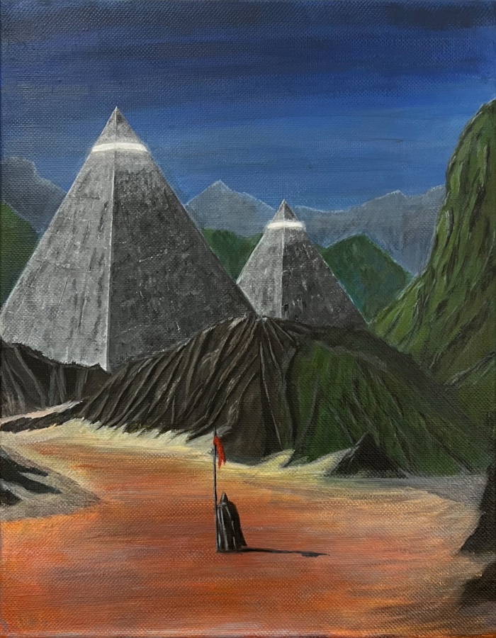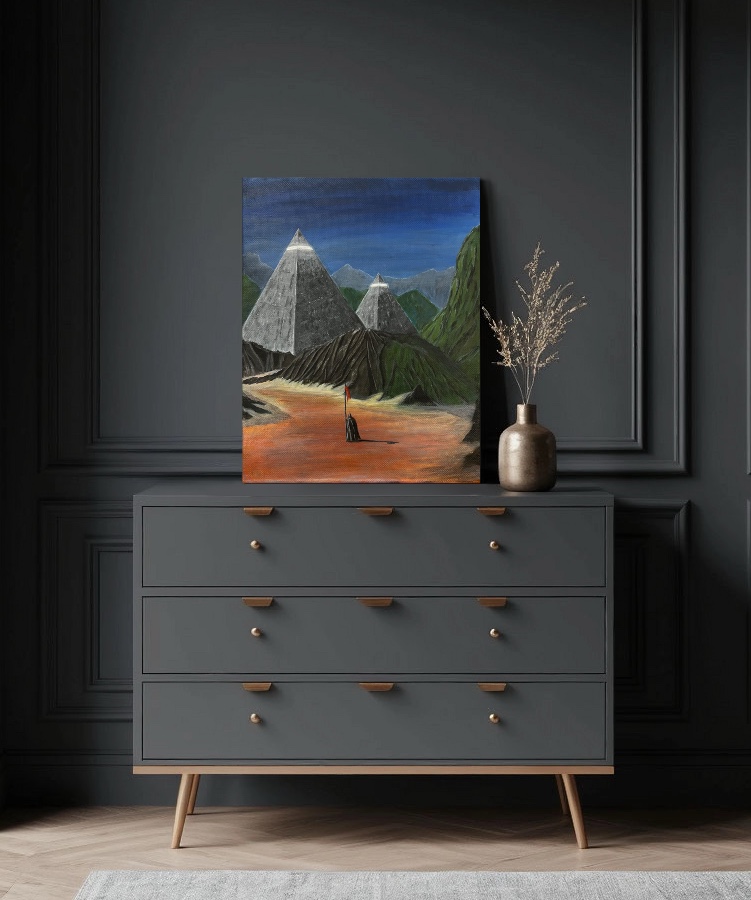 In the heart of a forgotten desert, where the echo of times whispers through the silvery moonlight, ancient sentinels—majestic pyramids with gleaming summits—guard the secrets of the stars. Green hills, shrouded in a mist of mystery, beckon one inward, promising revelations of lost worlds where time stands still and the soul merges with the infinity of the cosmos. This painting is a portal to a world that once existed.
